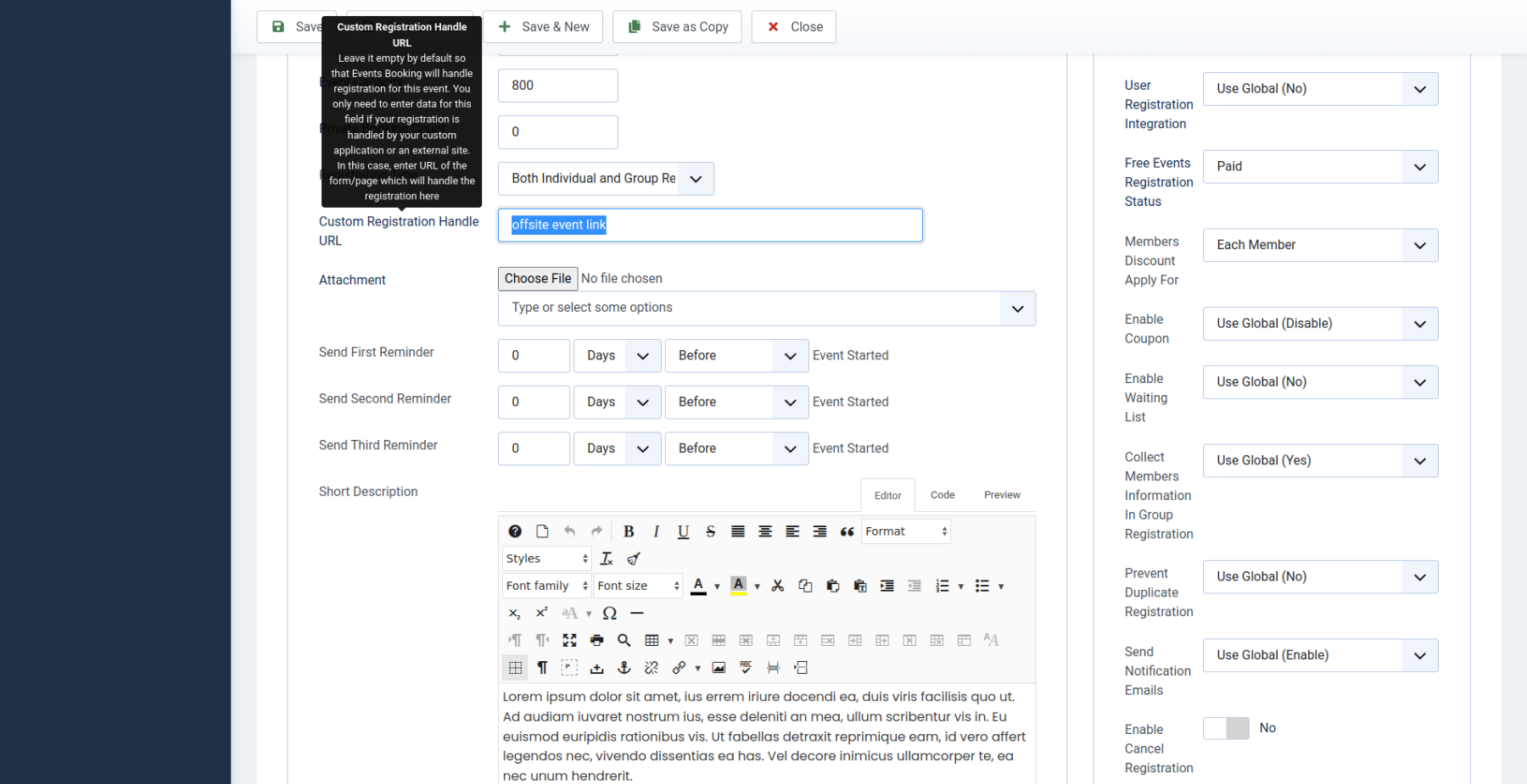 Are you called "Custom Registration Handle URL" field in Event Detail as "offsite event link"?