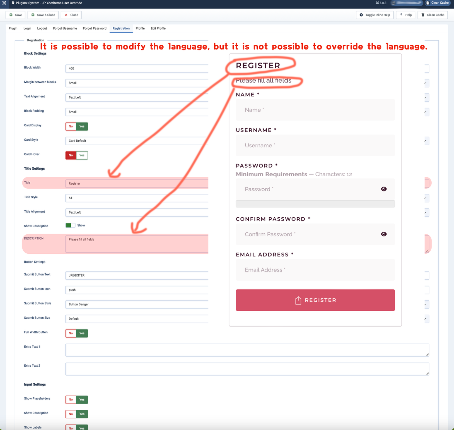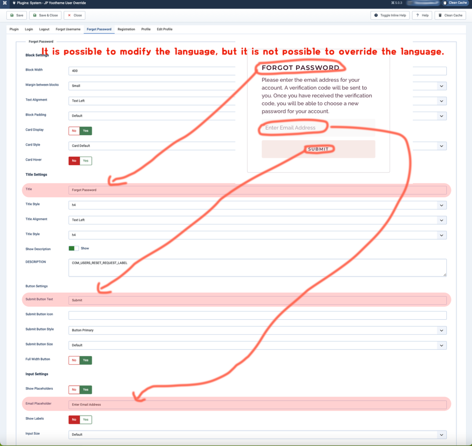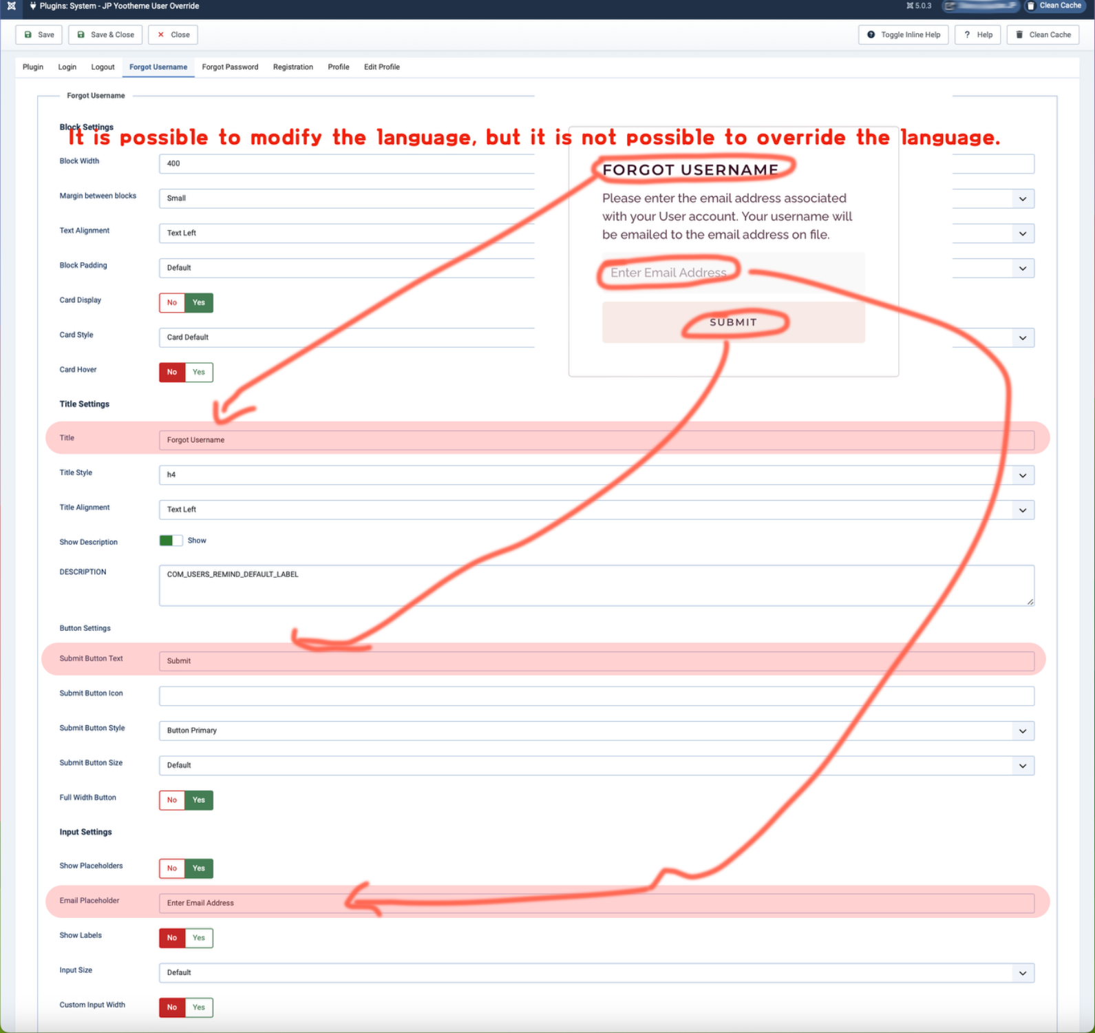 Fixed the Forgot username Email placeholder and Forgot password Email placeholder language overrides, released new version JP Yootheme User Tools - 2.0.7. Please check after update. Thanks
