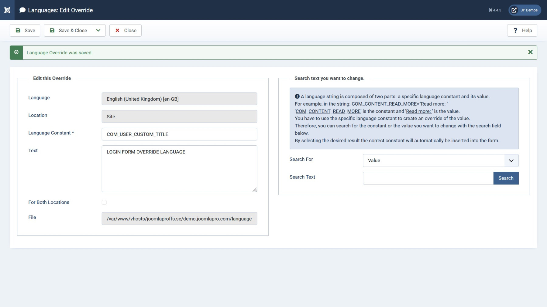 3. Add "COM_USER_CUSTOM_TITLE" in Language Constant' field and add language override value in 'Text' field