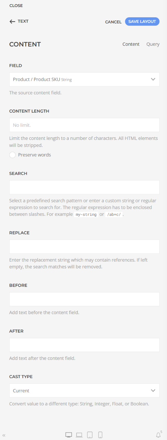 I'm afraid I can't see that. When I click the Edit icon on the SKU source in my Text element, I see this: