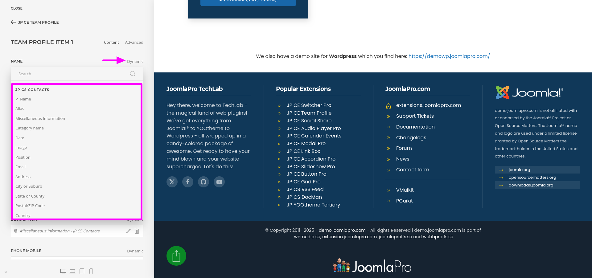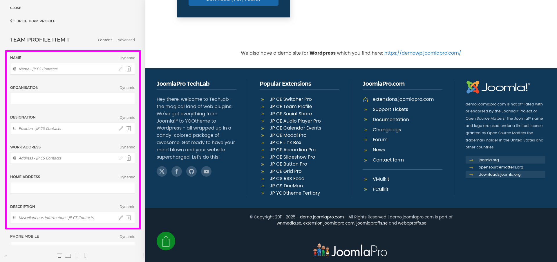 JP CS Contacts is a Custom Source plugin for YOOtheme Pro that brings the native Joomla Contacts system into your dynamic content workflow. Easily display employees, team members, or community directories with the full power of YOOtheme elements.