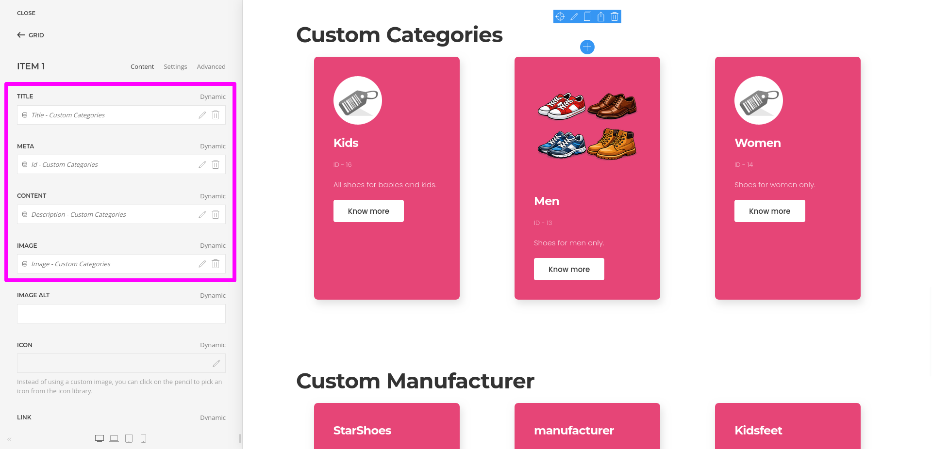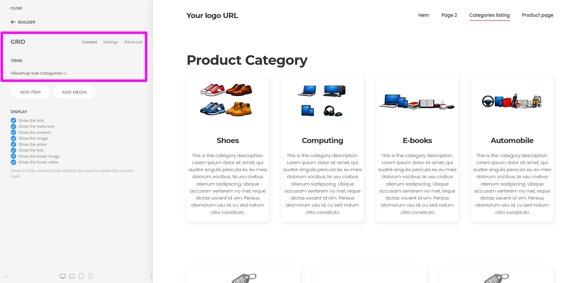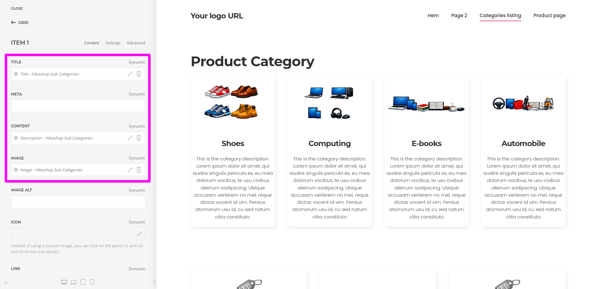 - You can use grids, repeatable items, headings, images, and text elements to create category layouts that match your site design.