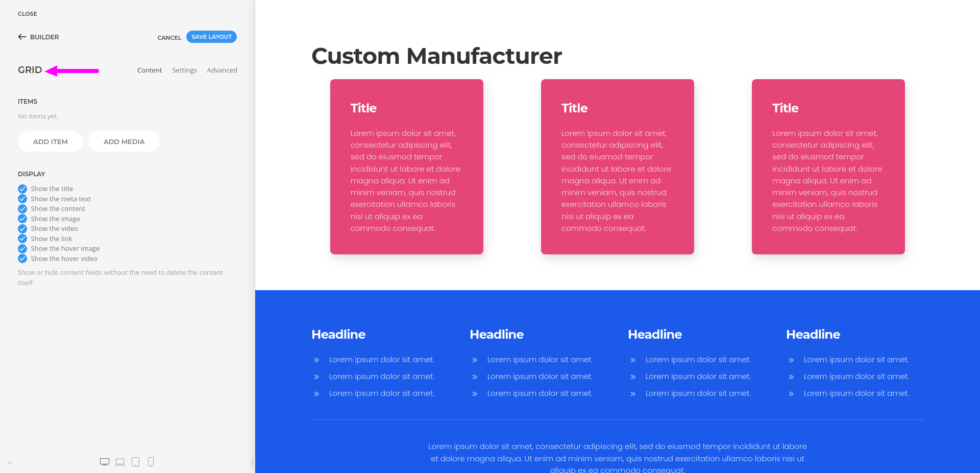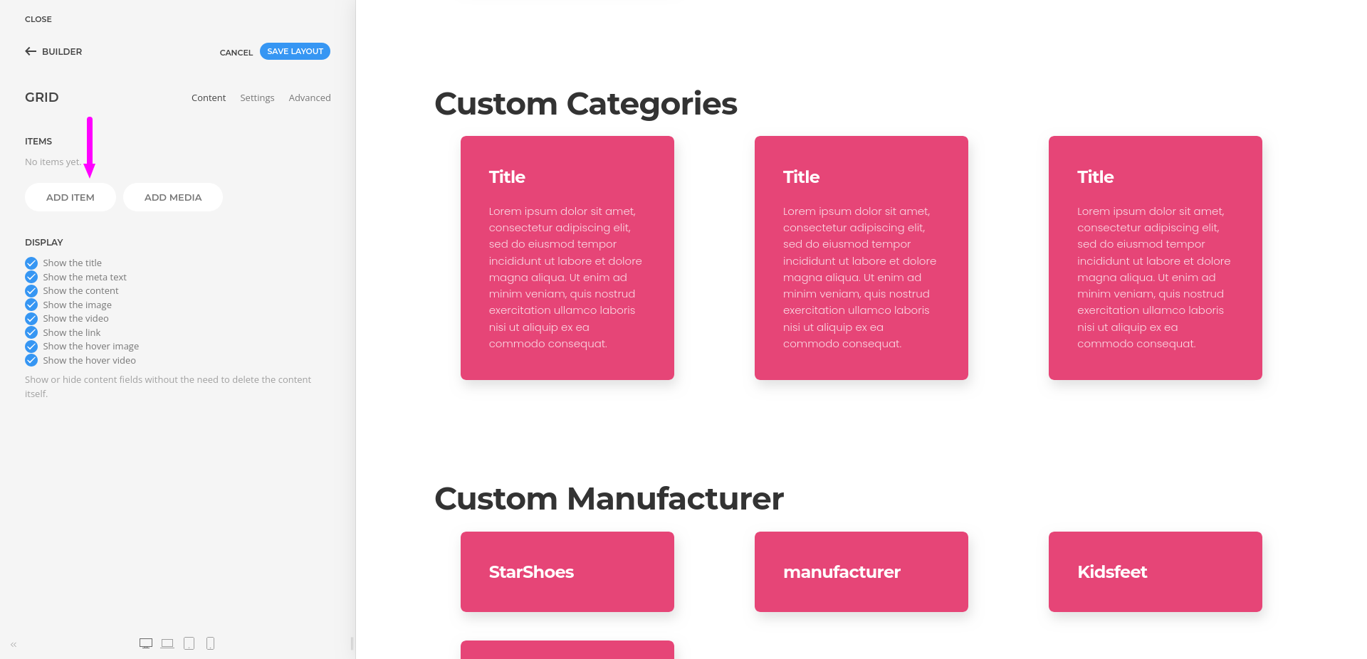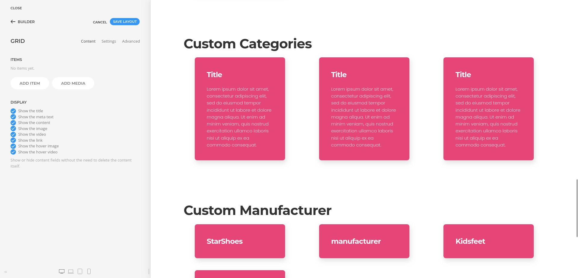 - You can use grids, repeatable items, headings, images, and text elements to create category layouts that match your site design.