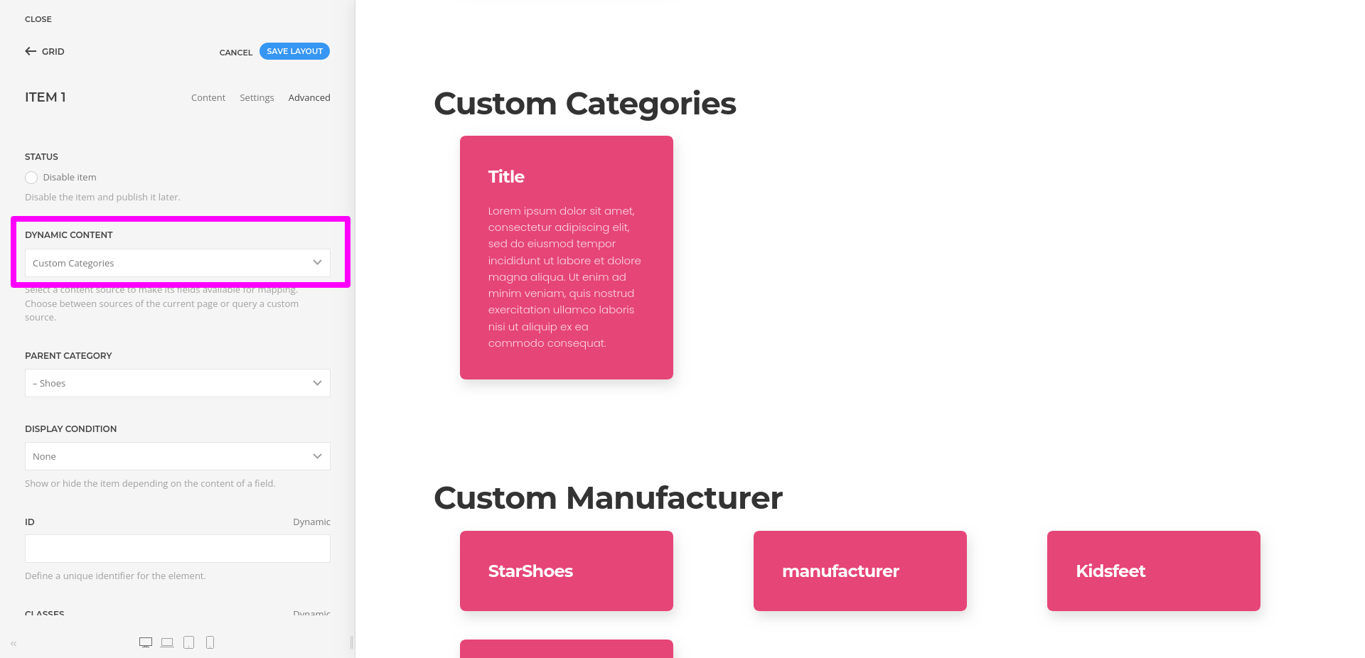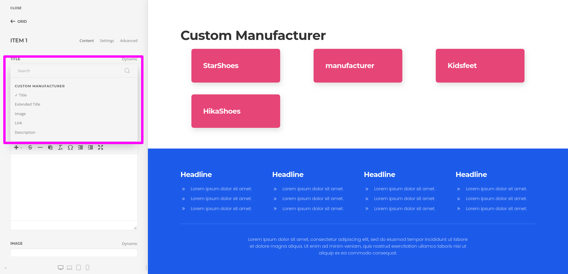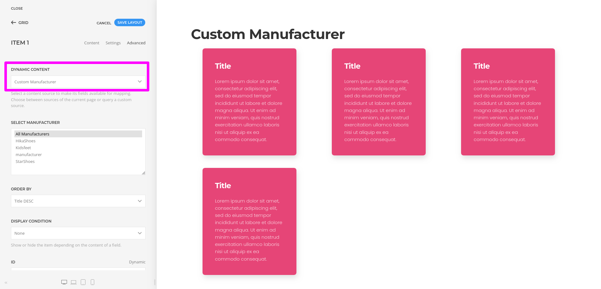 - Add a new item or edit the existing element, then open the “Advanced” tab and select the manufacturer dynamic content source.