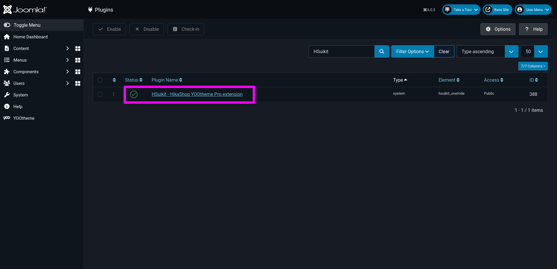 - From the main Joomla dashboard click “System -> Manage -> Extensions”. Use the Search or Filter feature to find the installed HSuikit Core extension and then make sure the required plugin is enabled.