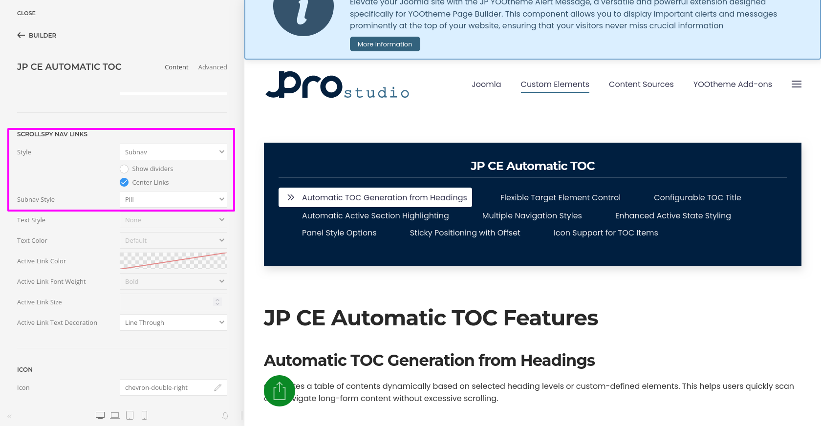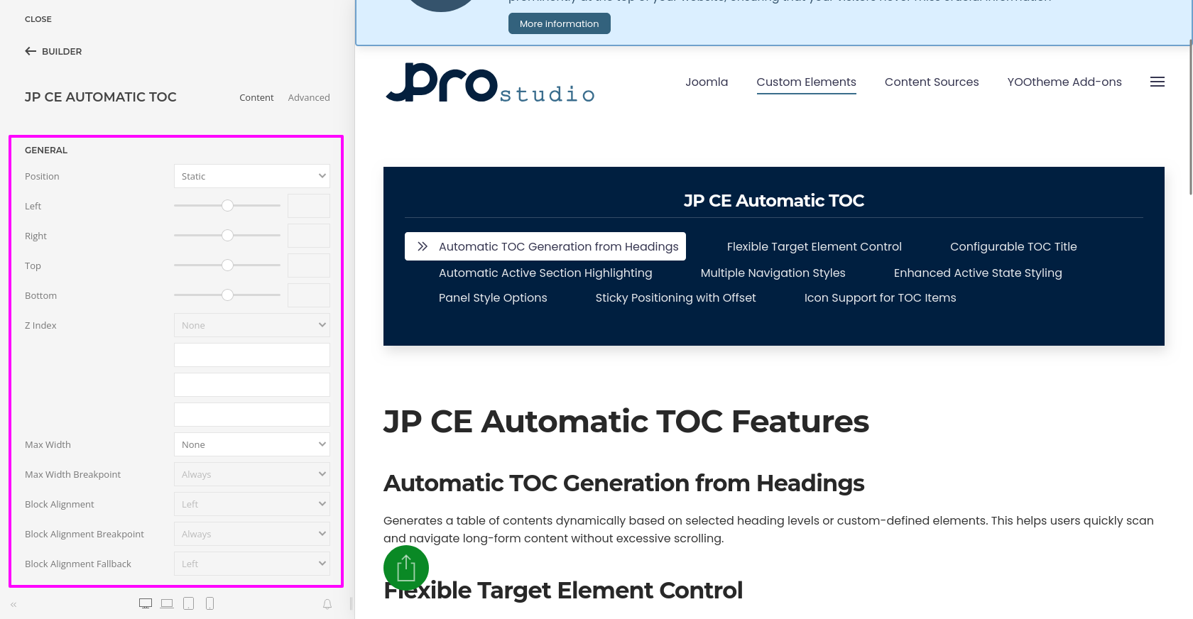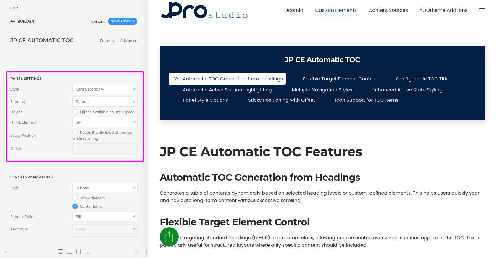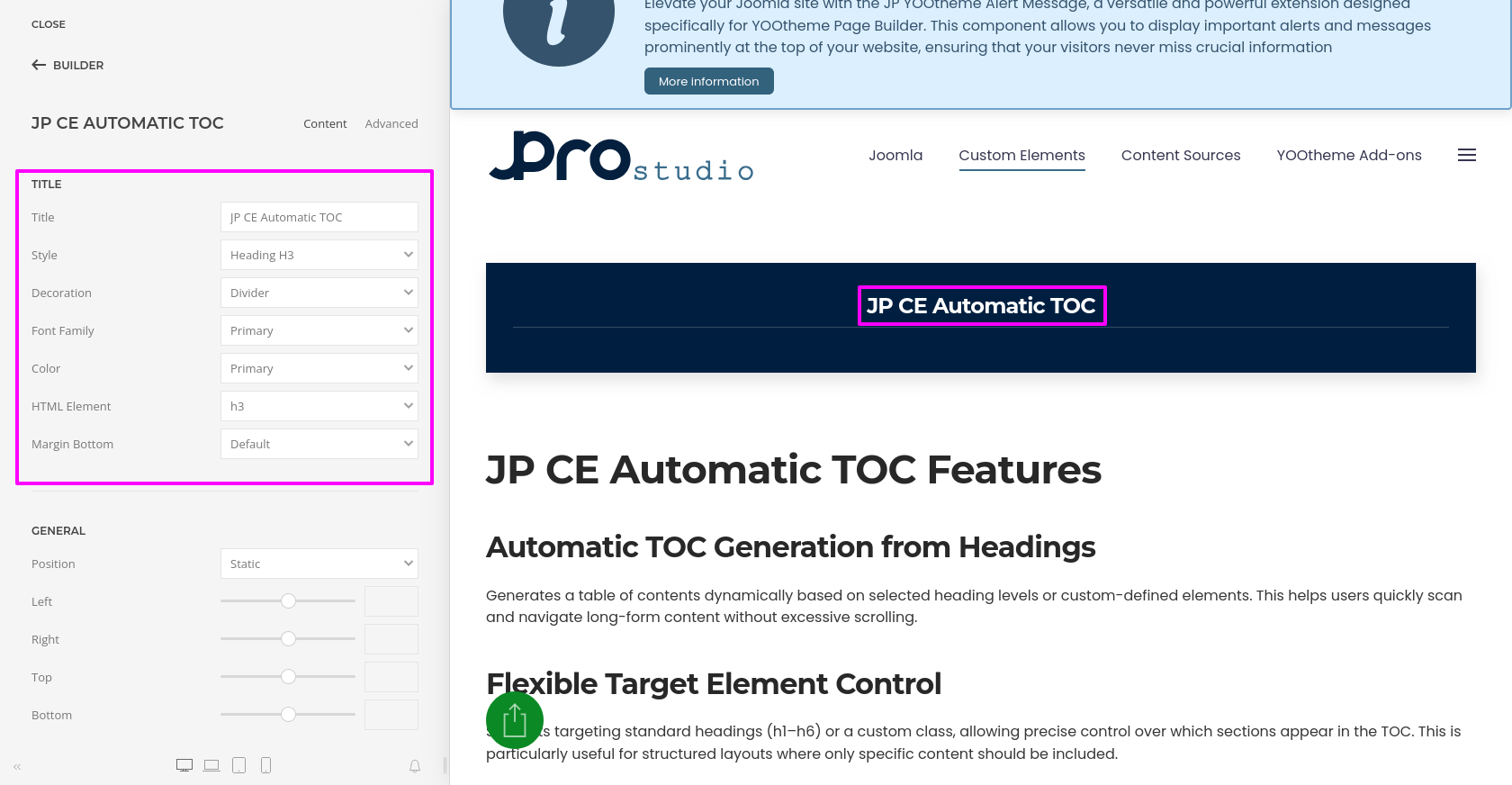 JP CE Automatic TOC provides you with an easy way to automatically generate a structured and accessible table of contents from your page headings. Using this custom element, you can improve navigation for long articles, documentation pages, help sections, and other content-heavy layouts inside YOOtheme Pro.