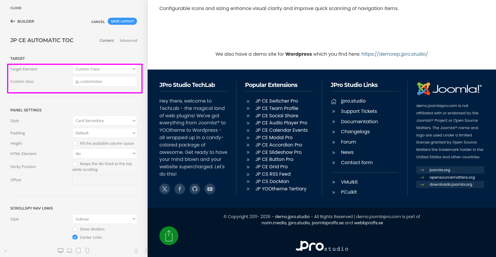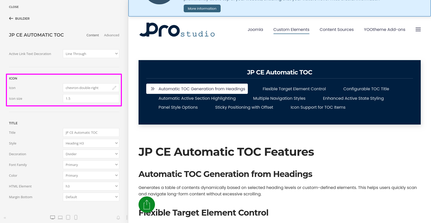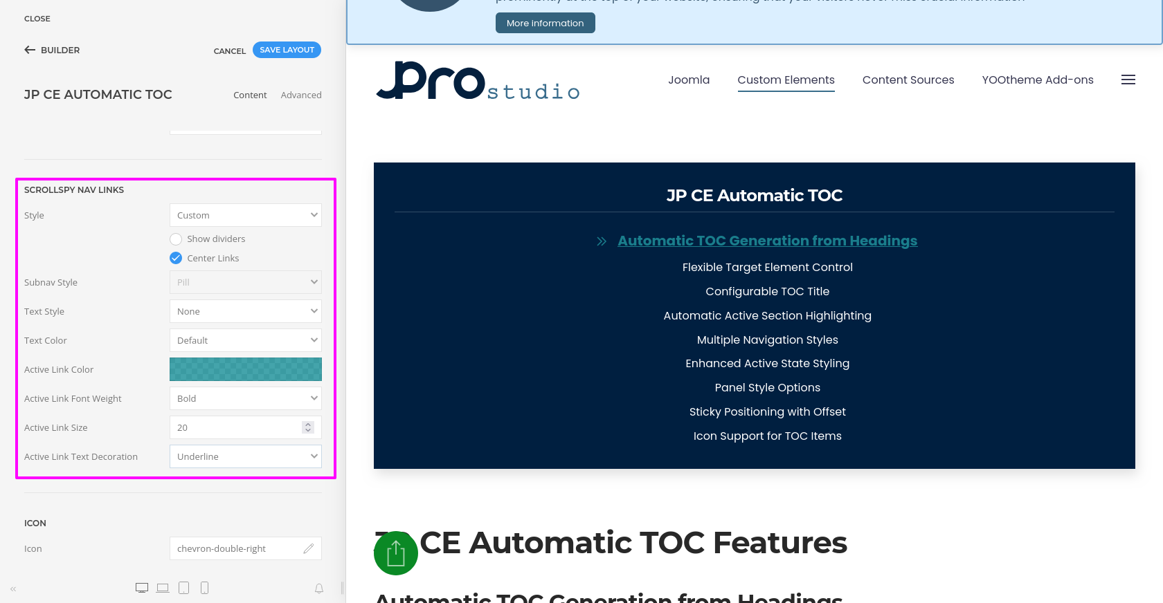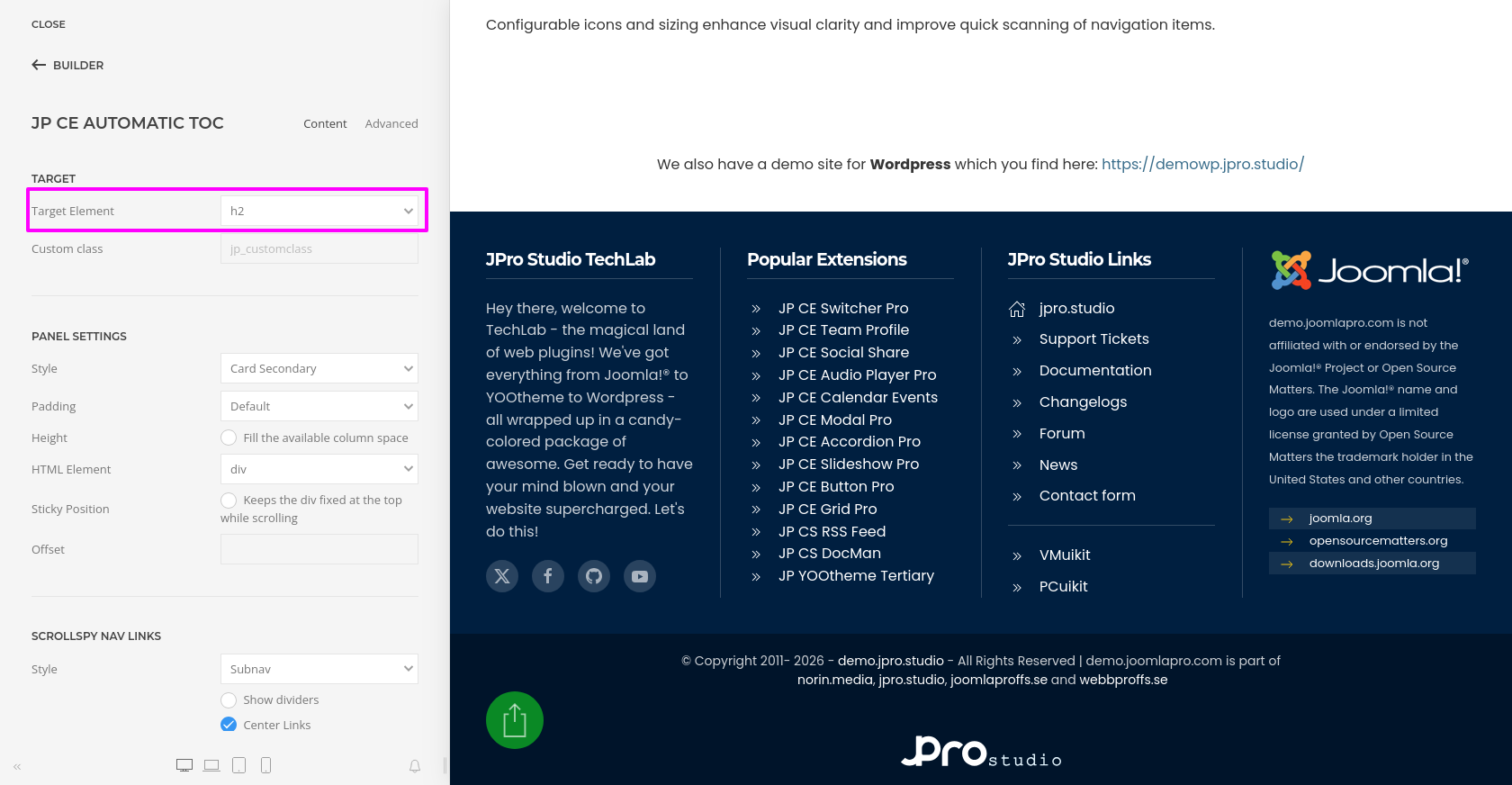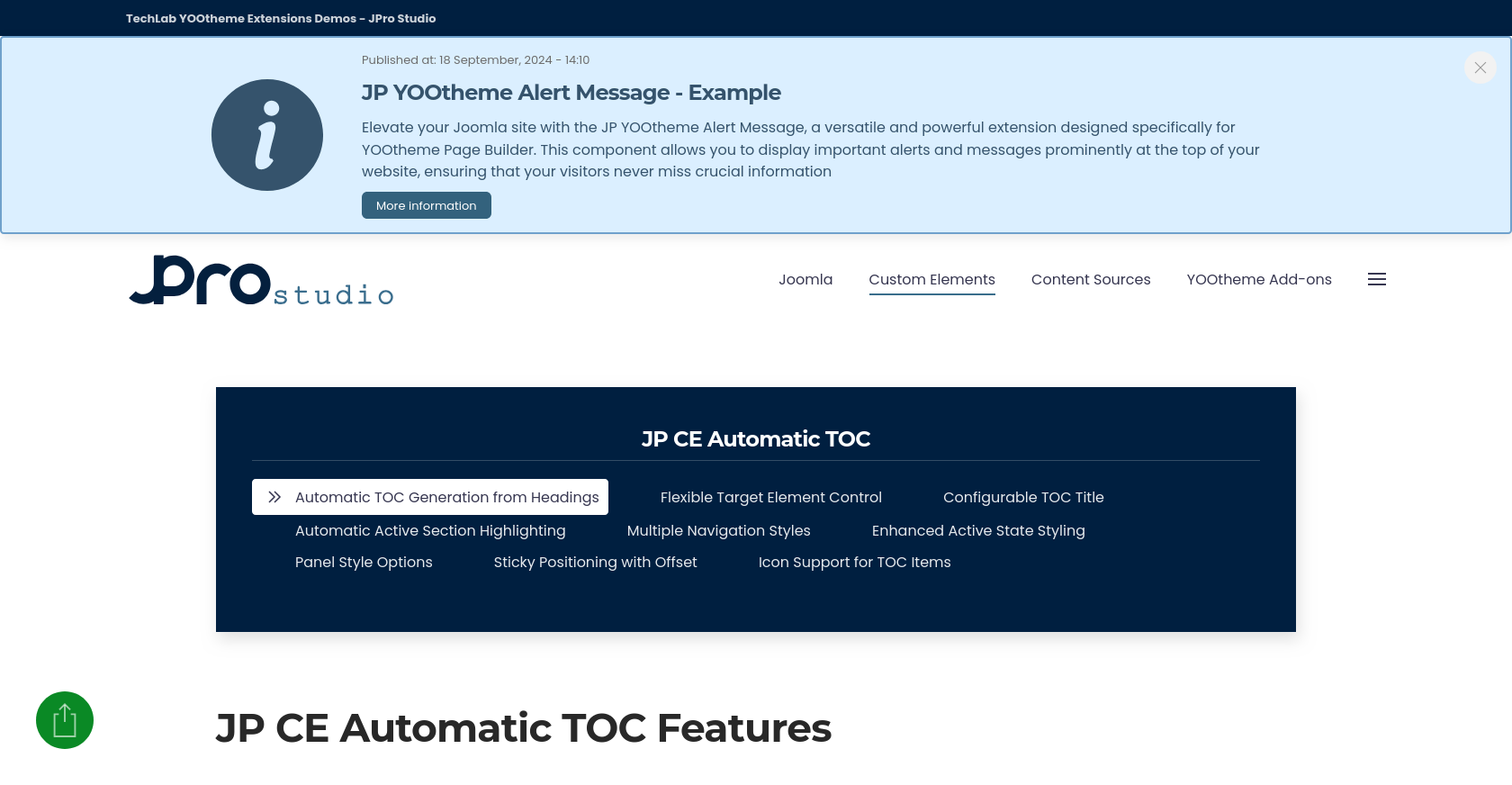JP CE Automatic TOC provides you with an easy way to automatically generate a structured and accessible table of contents from your page headings. Using this custom element, you can improve navigation for long articles, documentation pages, help sections, and other content-heavy layouts inside YOOtheme Pro.