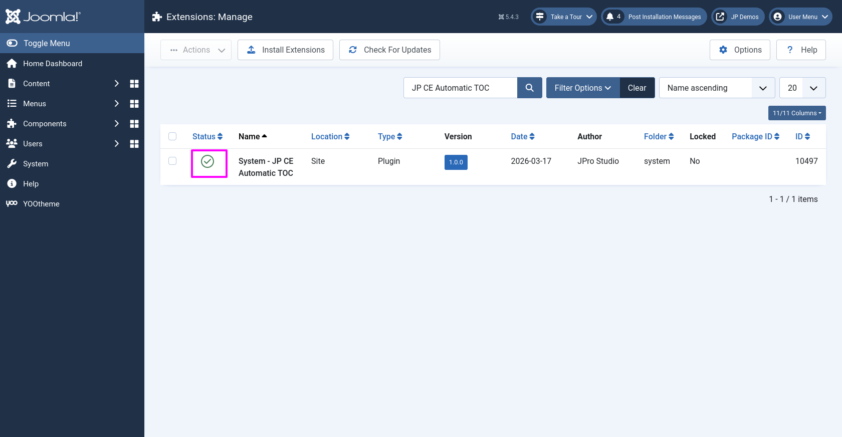 - From the main Joomla dashboard click “System -> Manage -> Plugins”. Use the Search or Filter feature to find the installed JP CE Automatic TOC plugin and then make sure the installed plugin is enabled.
