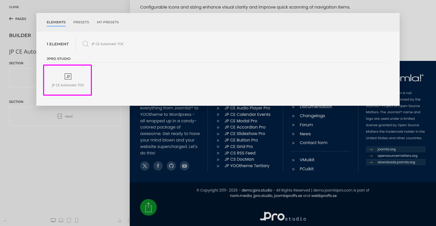 - Then you can easily add the installed “JP CE Automatic TOC” custom builder element from YOOtheme Pro Website Builder.