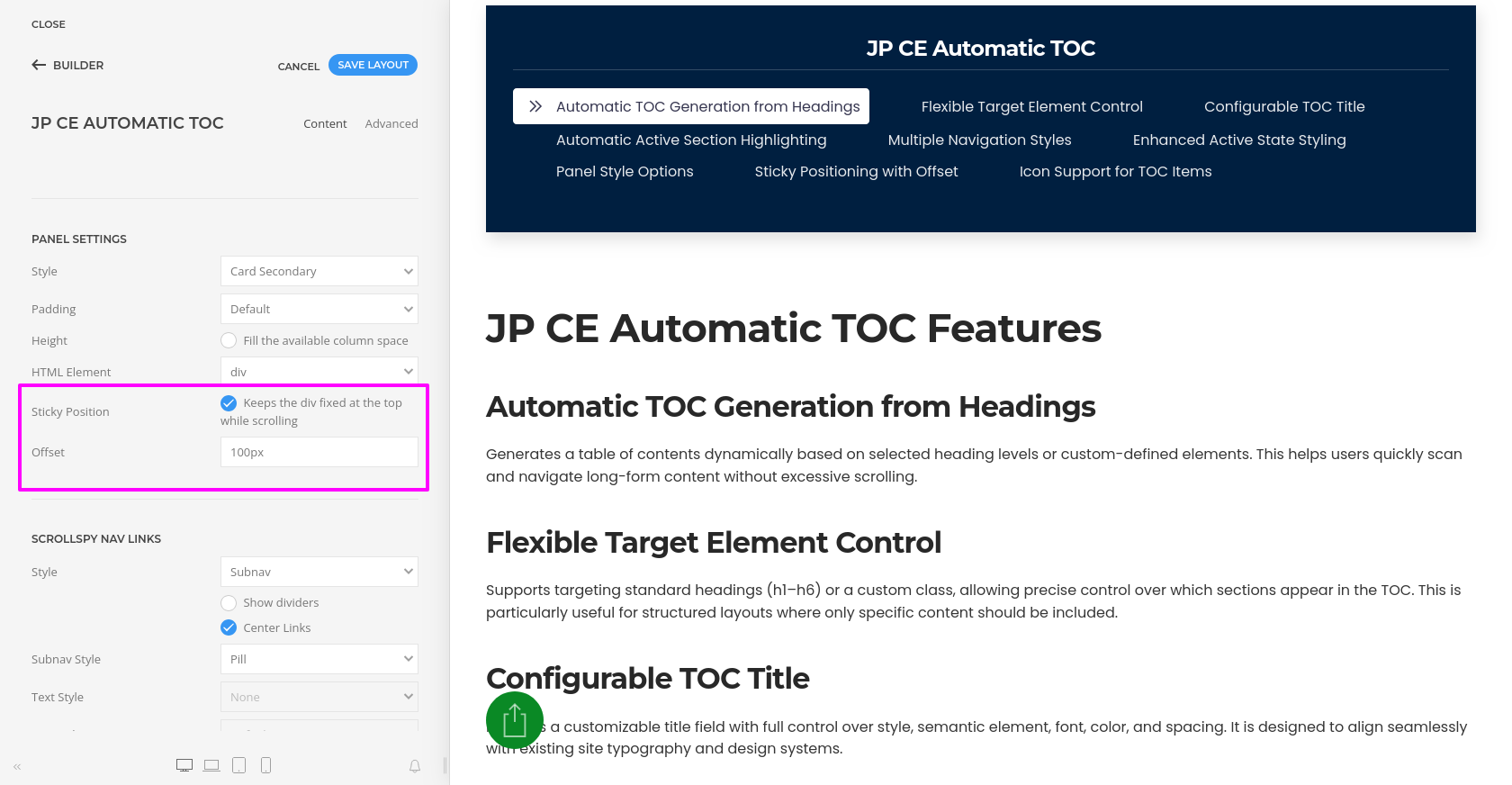 - You can also enable Sticky Position so the TOC remains visible while scrolling. Use the Offset option to prevent linked headings from being hidden behind a sticky header. A recommended value is 80px to 120px, depending on your header height.