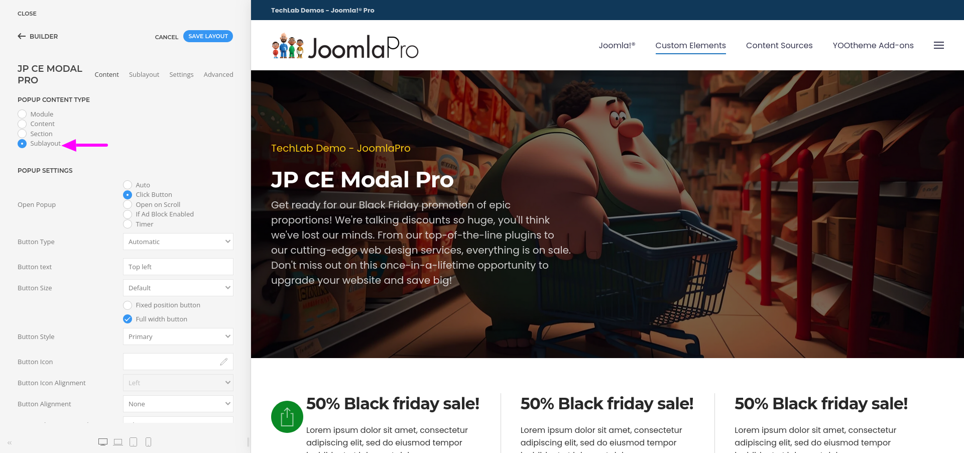 Sublayout is a powerful option that allows you to create nested layouts in the modal pro item, which also enables dynamically multiply a group of rows, making it ideal for displaying lists of categories or articles. It also define a parent source within the sublayout, allowing dynamic content to be displayed efficiently.
